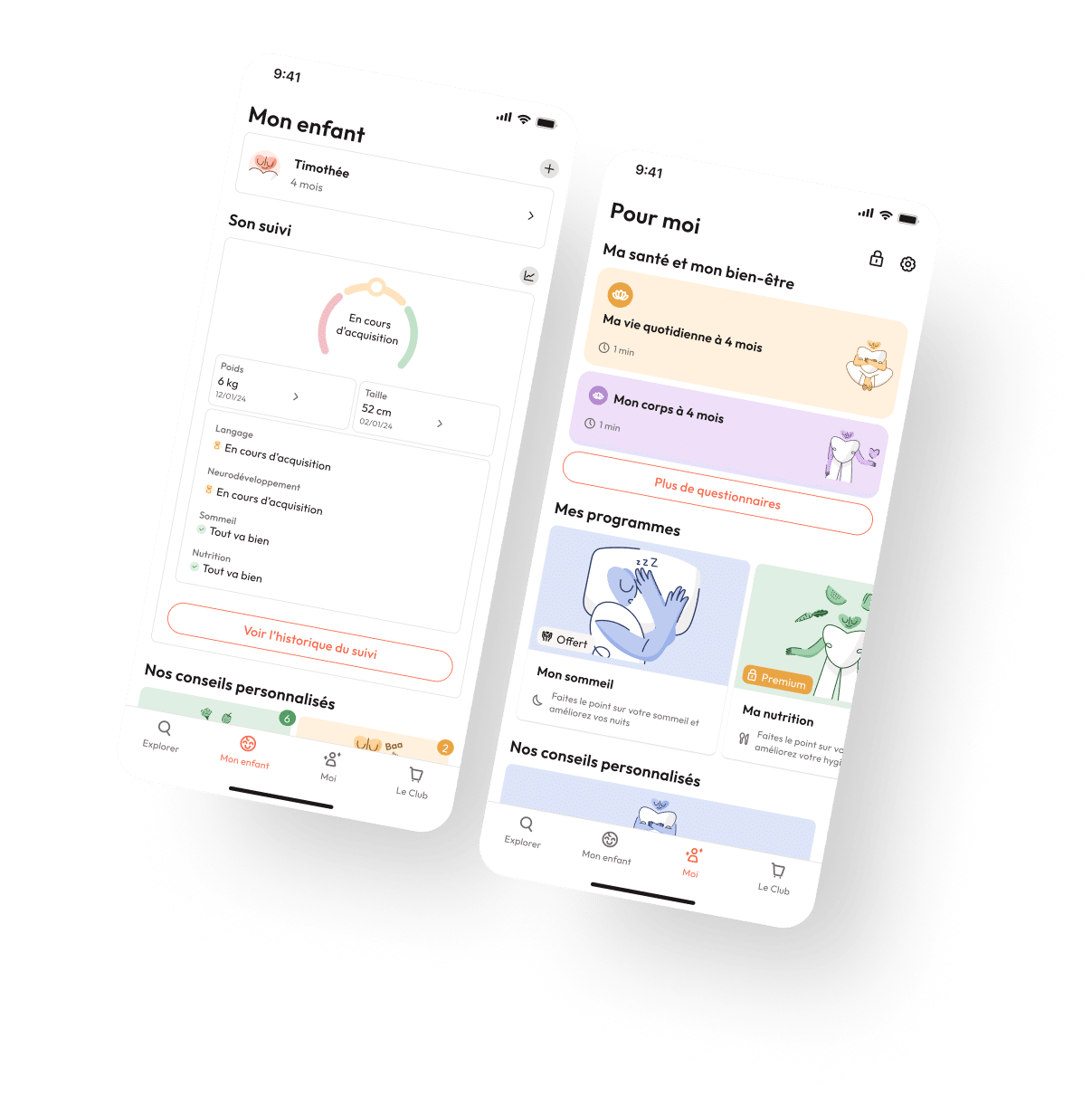 👉 Aider un maximum de parents à prendre soin d’eux-mêmes et de leurs enfants. Chaque mois, nous vous proposons de répondre à de courts questionnaires de santé, pour vous et votre enfant. En fonction de vos réponses, vous bénéficierez d’un parcours de santé personnalisé, ludique et adapté à vos besoins. Ainsi, vous renforcerez vos connaissances médicales. Vous saurez exactement ce qu’il faut faire ou éviter dans vos actions de santé. Enfin, vous disposerez de fiches pratiques pour vous guider au quotidien.